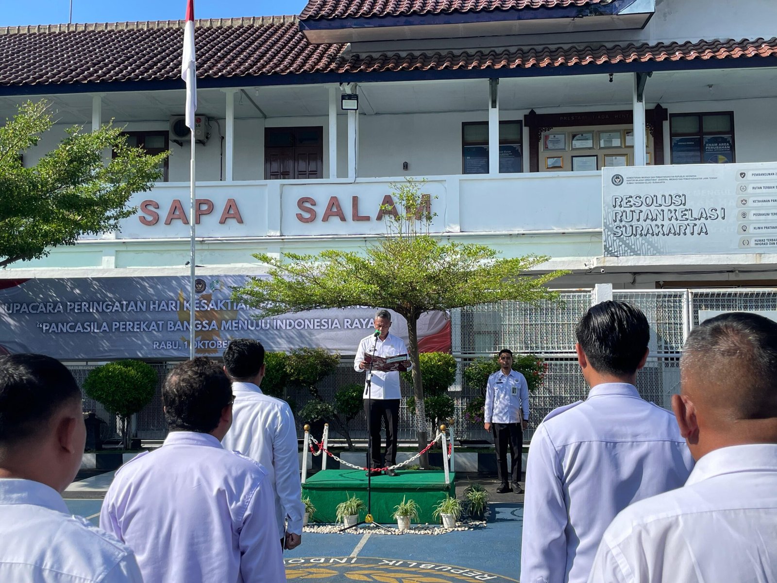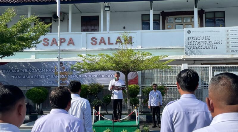 Surakarta – Rutan Kelas I Surakarta Kantor Wilayah Direktorat Jenderal Pemasyarakatan Jawa Tengah menggelar upacara bendera dalam rangka memperingati Hari Kesaktian Pancasila dengan penuh khidmat di halaman kantor, Selasa (01/10). Seluruh pegawai turut hadir dalam formasi lengkap, menunjukkan rasa hormat dan penghargaan terhadap nilai-nilai luhur ideologi bangsa.