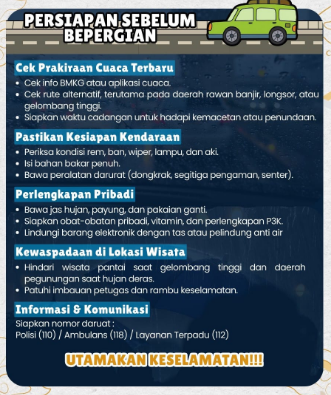 ‎Masyarakat diimbau tetap waspada dan berhati-hati saat bepergian darat, laut, dan udara, serta dalam merencanakan aktivitas luar ruangan. Informasi cuaca terkini dapat dipantau melalui berbagai platform resmi BMKG, seperti Instagram @infobmkg, website www.bmkg.go.id, dan aplikasi InfoBMKG, agar perayaan Nataru tetap aman dan nyaman.