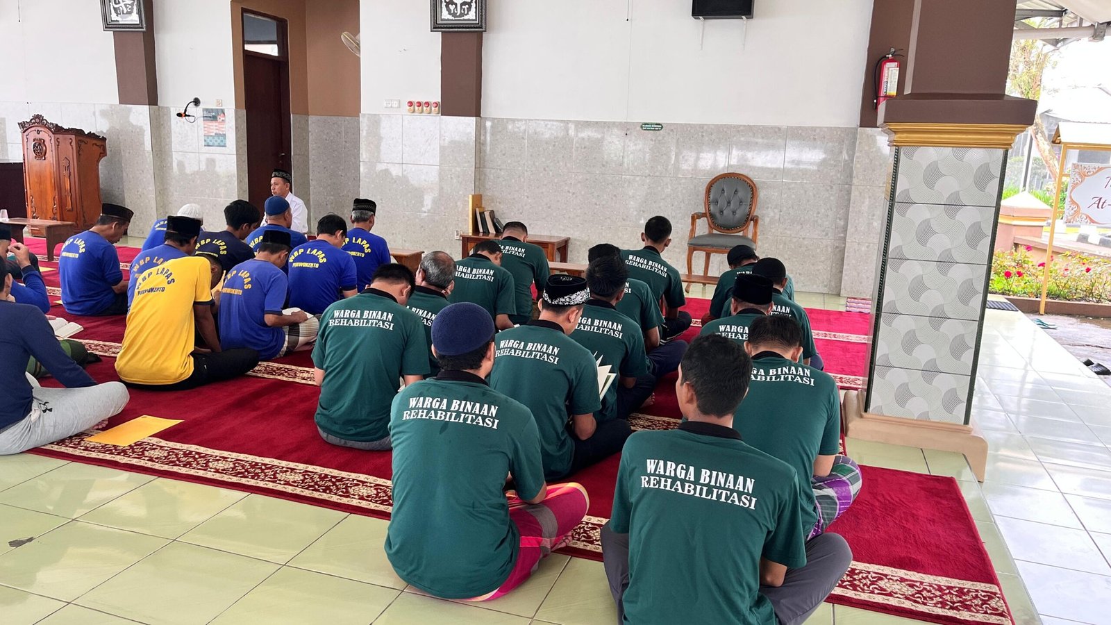 Usai senam, pembinaan dilanjutkan dengan kegiatan keagamaan yang dilaksanakan di dua tempat berbeda sesuai agama masing-masing warga binaan. Di Masjid At-Taubah, 15 warga binaan rehabilitasi muslim mengikuti Pembinaan Keagamaan Islam yang berisi pembacaan Al-Qur’an, tausiyah, dan diskusi keagamaan yang dipandu oleh ustadz dari mitra lembaga keagamaan.