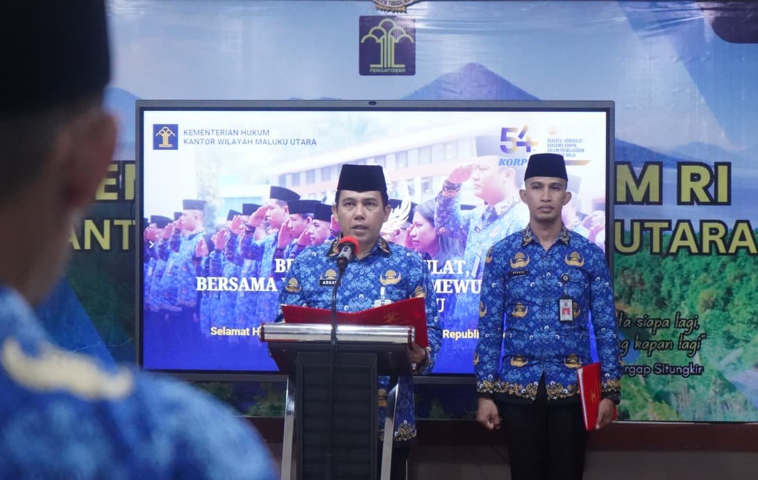 Ternate – Kantor Wilayah (Kanwil) Kementerian Hukum (Kemenkum) Maluku Utara (Malut) menyelenggarakan Upacara Peringatan Hari Ulang Tahun Korpri (KORPRI) ke-54 Tahun 2025 bertajuk “Bersatu Berdaulat, Bersama KORPRI mewudujkan Indonesia Maju” bertempat di Aula Gamala Lantai I Kanwil Malut.