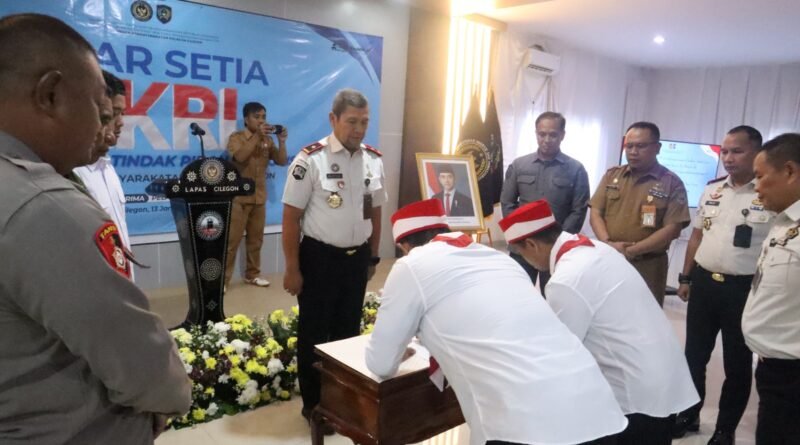 KORANDETAK.COM-Kantor Wilayah Direktorat Jenderal Pemasyarakatan (Kanwil Ditjenpas) Banten melaksanakan kegiatan Ikrar Setia kepada Negara Kesatuan Republik Indonesia (NKRI) bagi warga binaan tindak pidana terorisme di Lapas Kelas IIA Cilegon. Kegiatan ini berlangsung dengan tertib, aman, dan penuh khidmat serta dihadiri oleh unsur Badan Nasional Penanggulangan Terorisme (BNPT), Densus 88 Antiteror, TNI, Polri, Kementerian Agama, Kesatuan Bangsa dan Politik Kota Cilegon, serta jajaran pemasyarakatan.