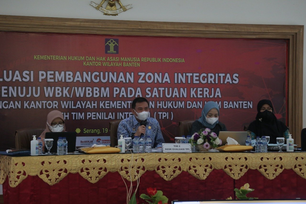 SERANG – Lembaga Pemasyarakatan Kelas IIA Serang Kanwil Kemenkumham Banten mengikuti kegiatan Desk Evaluasi Pembangunan Zona Integritas Menuju Wilayah Bebas dari Korupsi dan Wilayah Birokrasi Bersih dan Melayani oleh Tim Penilai Internal (TPI) Inspektorat Jenderal Kementerian Hukum dan HAM RI. Jumat (20/05)