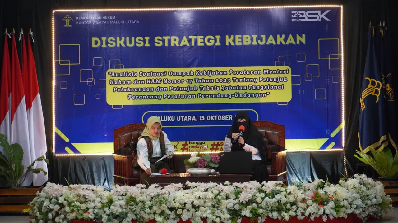Ternate – Kantor Wilayah Kementerian Hukum Maluku Utara menyelenggarakan Diskusi Strategi Kebijakan (DSK) dengan tema “Analisis Evaluasi Dampak Kebijakan Peraturan Menteri Hukum Nomor 17 Tahun 2023 tentang Petunjuk Pelaksanaan dan Petunjuk Teknis Jabatan Fungsional Perancang Peraturan Perundang-undangan”, bertempat di Aula Gamalama Kanwil Kemenkum Malut(15/10).