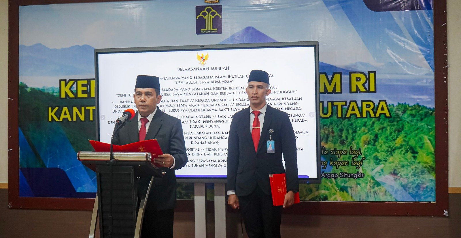 Ternate – Kepala Kantor Wilayah (Kakanwil) Kementerian Hukum (Kemenkum) Maluku Utara (Malut), Budi Argap Situngkir (BAS) melantik dan mengambil sumpah jabatan enam (6) notaris baru wilayah Provinsi Maluku Utara di Aula Gamalama Kantor Wilayah (Kanwil) Kementerian Hukum (Kemenkum) Maluku Utara (Malut), Senin (23/2/2026).