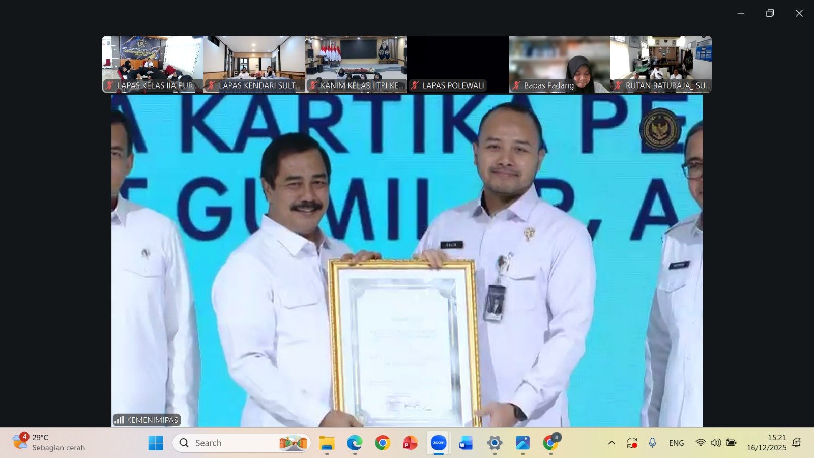 Purwokerto – Lembaga Pemasyarakatan Kelas IIA Purwokerto mengikuti kegiatan Penutupan Rapat Koordinasi Evaluasi dan Pengendalian Kinerja Kementerian Imigrasi dan Pemasyarakatan Tahun 2025 yang diselenggarakan secara daring melalui zoom meeting pada Selasa, 16 Desember 2025. Kegiatan ini diikuti oleh jajaran pimpinan dan pegawai Lapas Kelas IIA Purwokerto sebagai bentuk dukungan terhadap kebijakan dan arah strategis Kemenimipas.