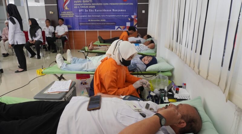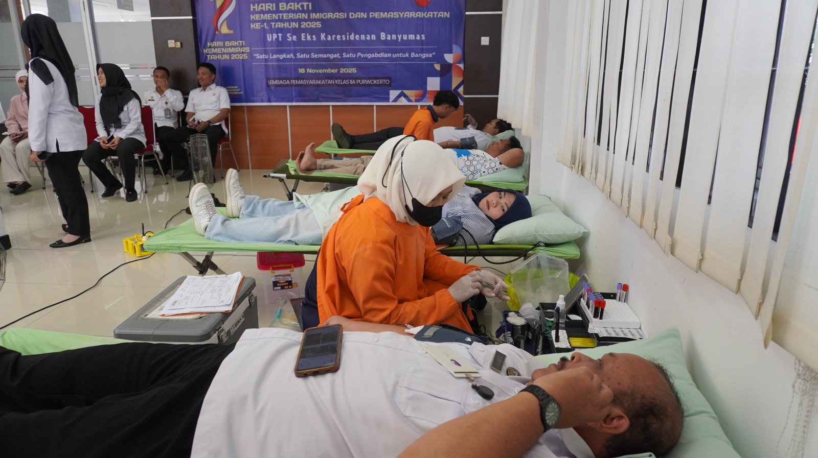 Purwokerto, 18 November 2025 — Lembaga Pemasyarakatan Kelas IIA Purwokerto menggelar kegiatan Donor Darah UPT Se-Eks Karesidenan Banyumas dalam rangka memperingati Hari Bakti Kementerian Imigrasi dan Pemasyarakatan Ke-1. Kegiatan ini bekerja sama dengan Tim Mobile Unit Donor Darah Palang Merah Indonesia (PMI) Kabupaten Banyumas dan berlangsung dari pukul 08.00 hingga 11.30 WIB di area Lapas Kelas IIA Purwokerto.