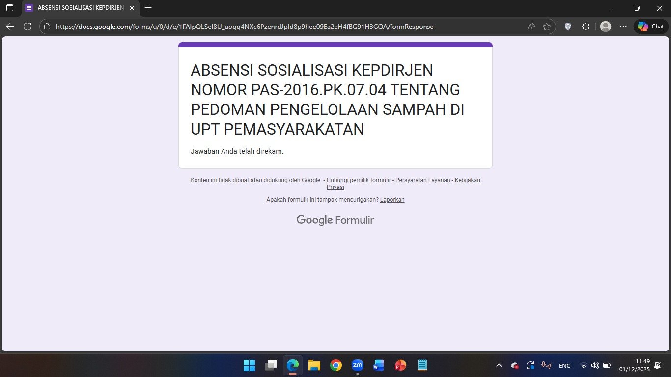 Lapas Kelas IIA Purwokerto mengikuti kegiatan Sosialisasi Keputusan Direktur Jenderal Pemasyarakatan Nomor PAS 2016.PK.07.04 Tahun 2025 tentang Pedoman Pengelolaan Sampah berbasis Ekonomi Sirkular, yang dilaksanakan secara daring melalui Zoom pada Senin (1/12). Kegiatan ini merupakan tindak lanjut dari surat resmi Ditjen Pemasyarakatan dan diikuti oleh seluruh UPT Pemasyarakatan di Indonesia.
