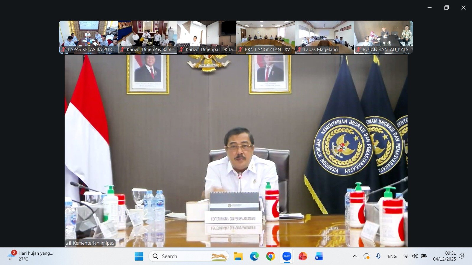 Lapas Kelas IIA Purwokerto mengikuti Zoom Meeting Arahan Menteri Imigrasi dan Pemasyarakatan mengenai persiapan pengadaan bahan makanan Tahun Anggaran 2026 pada Kamis, 4 Desember 2025. Kegiatan digelar pukul 09.00–11.00 WIB di Ruang Rapat Kepala Lapas dan diikuti oleh KPA, PPK, serta pejabat struktural. Pertemuan ini menjadi langkah awal memastikan pelaksanaan pengadaan bahan makanan berjalan efektif dan sesuai ketentuan.