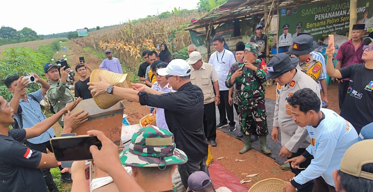 Kepala Dinas Ketahanan Pangan dan Pertanian atau DKPP Kabupaten Serang, Suhardjo bersama Wakapolres Serang Kabupaten Komisaris Polisi (Kompol) Andri Surya Kurniawan melakukan Gerakan Tanam serta Panen Raya Jagung Serentak Kuartal I Tahun 2026 di areal pertanian Kelompok Tani (Poktan) Tani Maju, Desa Mekar Baru, Kecamatan Kopo pada Jum’at, 6 Februari 2026.