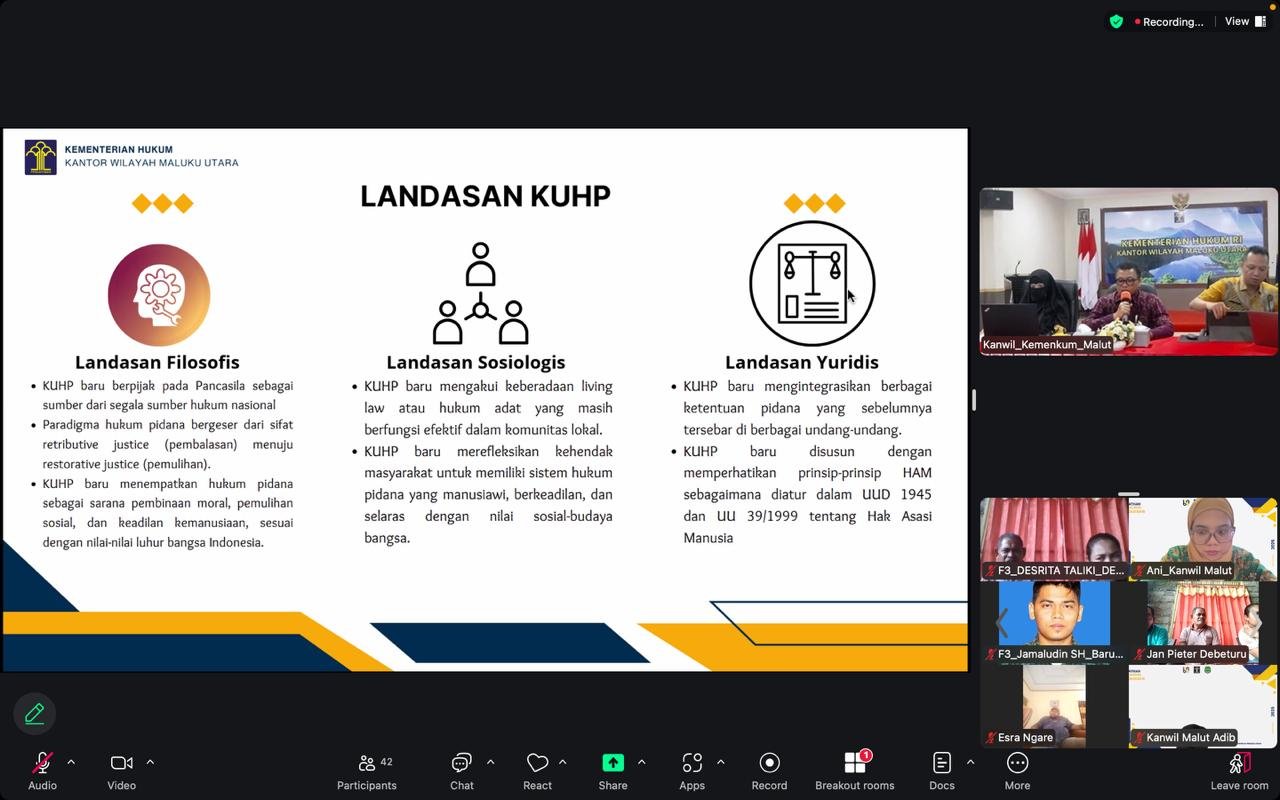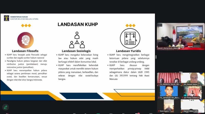 Dalam rangka meningkatkan kompetensi paralegal, Kantor Wilayah (Kanwil) Kementerian Hukum (Kemenkum) Maluku Utara (Malut) menyelenggarakan Sosialisasi KUHP Baru bagi peserta Pelatihan Paralegal Serentak Batch IV yang digelar secara daring, Kamis (13/11).