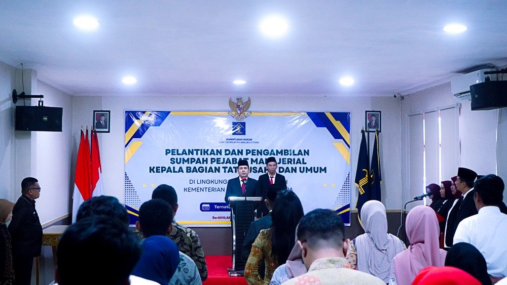 Ternate – Kepala Kantor Wilayah (Kakanwil) Kementerian Hukum (Kemenkum) Maluku Utara (Malut), Budi Argap Situngkir memimpin langsung pelantikan dan pengambilan sumpah pejabat manajerial Kepala Bagian Tata Usaha dan Umum di lingkungan Kemenkum Malut, bertempat di Aula Gamalama lantai I Kanwil, Kamis (11/12/2025).