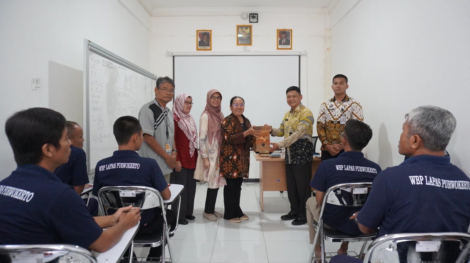 Setelah sesi materi, kegiatan dilanjutkan dengan praktik lapangan untuk melihat langsung proses pemeliharaan lebah klanceng. Pada kesempatan tersebut, Prof. Dr. rer. nat. Imam Widhiono, M.Z., M.S., selaku ketua tim dosen, menyerahkan satu koloni madu lebah klanceng kepada pihak lapas sebagai dukungan bagi pengembangan program pembinaan kemandirian di lingkungan Lapas Kelas IIA Purwokerto.