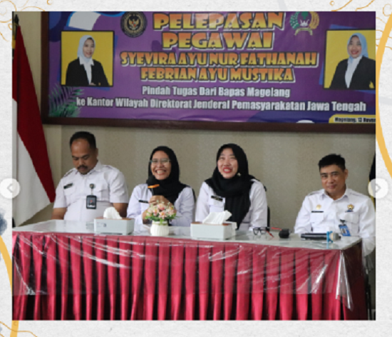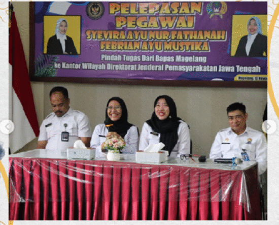 Magelang, 13 November 2025 – Balai Pemasyarakatan (Bapas) Kelas II Magelang menggelar acara pelepasan dua pegawai terbaiknya, yaitu Febrian Ayu Mustika dan Syevira Ayu Nur Fathanah, yang mendapat promosi dan alih tugas ke jenjang jabatan yang lebih tinggi.
