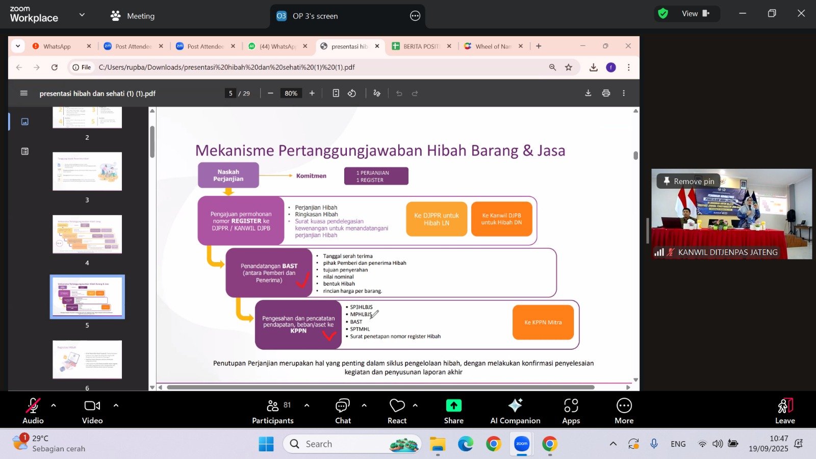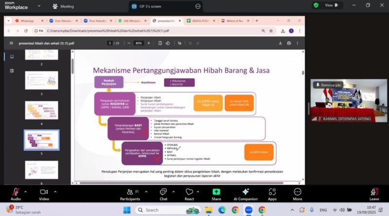 Purwokerto – Lembaga Pemasyarakatan (Lapas) Kelas IIA Purwokerto mengikuti secara virtual kegiatan Pembinaan Administrasi Pengelolaan Hibah Langsung yang diselenggarakan oleh Kantor Wilayah Direktorat Jenderal Pemasyarakatan (Ditjen PAS) Jawa Tengah, Jumat (19/9).