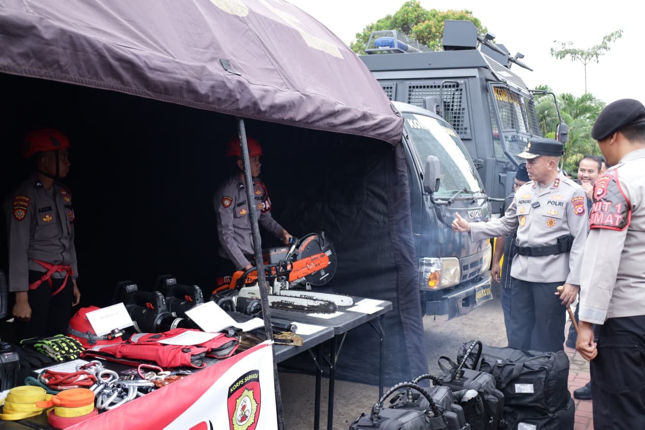 Apel kesiapan ini diakhiri dengan pengecekan pasukan serta sarana dan prasarana penanggulangan bencana, mulai dari kendaraan taktis, peralatan SAR, hingga logistik pendukung (Bidhumas).