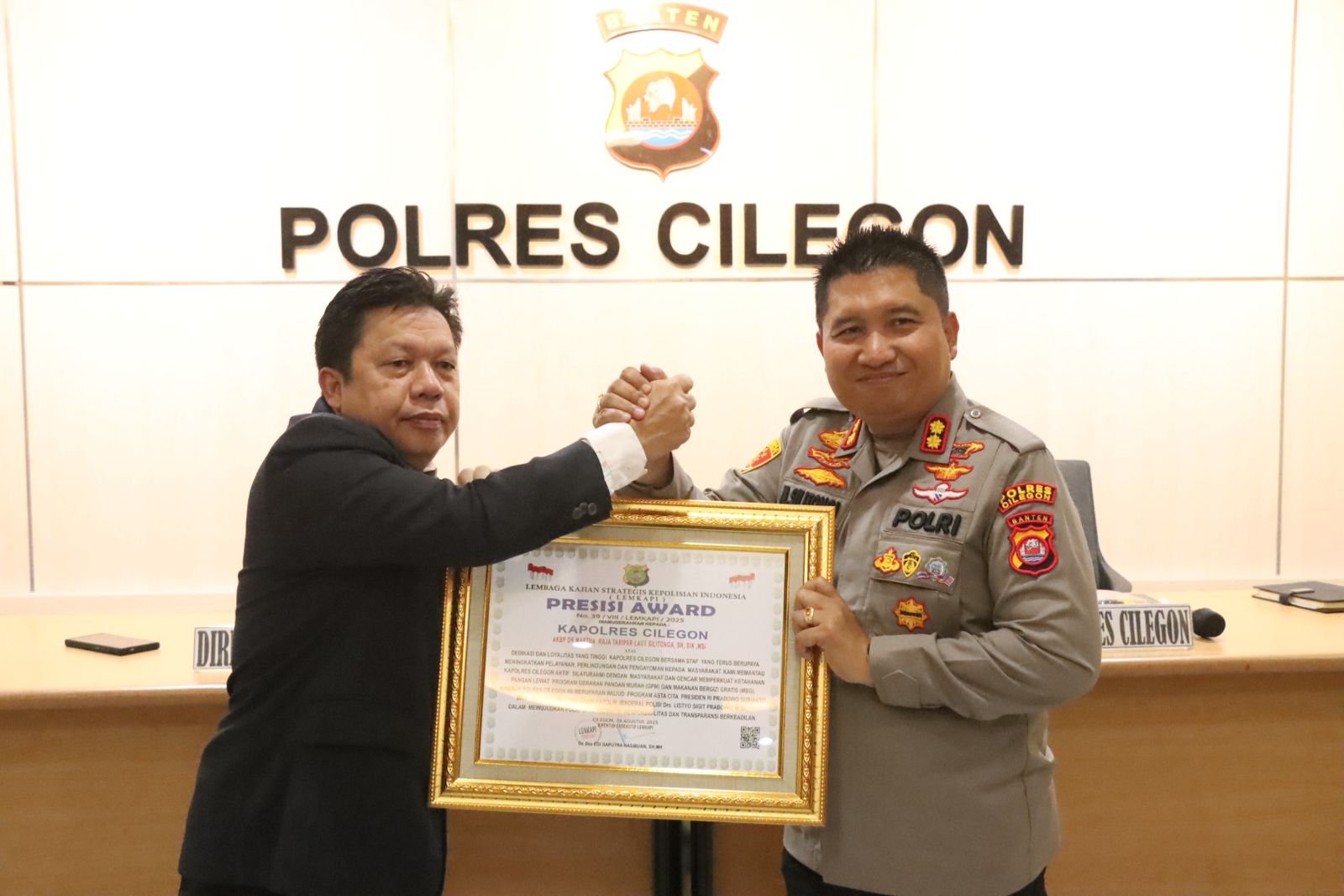 Kapolres Cilegon AKBP Dr. Martua Raja Taripar Laut Silitonga, S.H., S.I.K., M.Si. menerima Presisi Award dari LEMKAPI sebagai bentuk apresiasi atas kinerja dan inovasi Polres Cilegon.