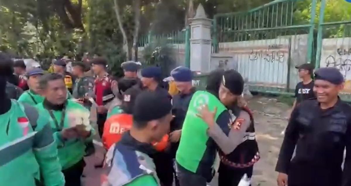 Di sepanjang Jalan Medan Merdeka Selatan, barisan aparat Brimob Polri tampak berjajar rapi. Aksi saling berjabat tangan antara pengemudi ojol dan aparat disertai pemberian bunga mawar menjadi simbol kebersamaan dan pesan damai.