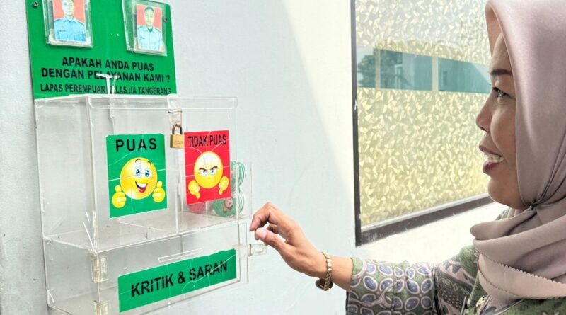 Tangerang, 15 November 2025 — Lapas Perempuan Kelas IIA Tangerang melaksanakan survei kepuasan layanan di area Pintu Utama (P2U) menggunakan mekanisme kartu penilaian yang dimasukkan ke dalam kotak survei oleh pengunjung.